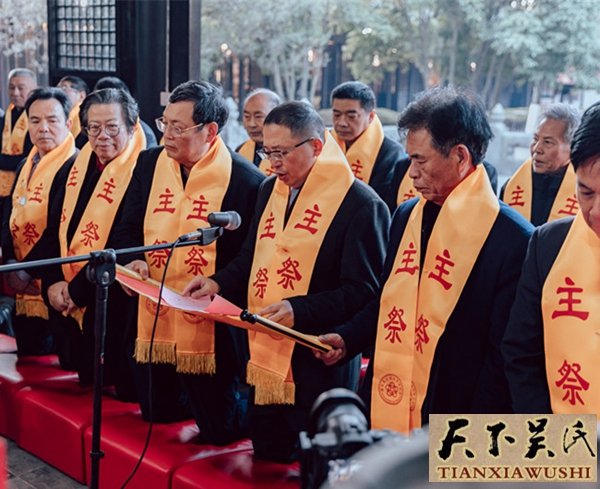 祖地祭典,全球瞩目。本次祭典因防疫抗疫因素,外地宗亲未能前来祖地祭拜,但海内外各地宗亲宗贤发出同一呼声:千里水流,皆出同源;至德情怀,流传千古。参加祭拜的祖地代表们,心里装着全宇宙吴氏宗亲血脉深情,冒着严寒,身着西服,肩佩耀眼夺目的黄色红字飘带,在司仪吴明刚清脆宏亮的嗓音下、配着雄壮的吴歌乐曲秩序井然,庄严肃穆。参祭人员有:泰伯吴氏祖地宗亲总会会长吴新、名誉会长吴立兴、顾问委员会主任吴仁山,宗贤代表有:吴亚南、吴锡泉、吴振达、吴焕其、吴明刚、吴健龙、吴福娇、吴才兴、吴林春、吴玉明、吴福兴、吴国强、吴国平、吴卫祖、吴胤悦、吴荣大、吴建东、吴刚虹、吴士德、吴文新、吴燕来、吴张军、吴强、吴峻飞、吴乐一等,本次祭祖大典由泰伯吴氏祖地宗亲总会副会长吴明刚宗贤担任司仪,执事有吴建平、吴燕来、吴建东、吴汇栋等。他们齐刷刷地跪于无锡梅村泰伯庙至德殿前,谨向我们共同的先祖列宗,呈上最诚挚的敬意和深深的叩拜!