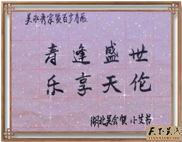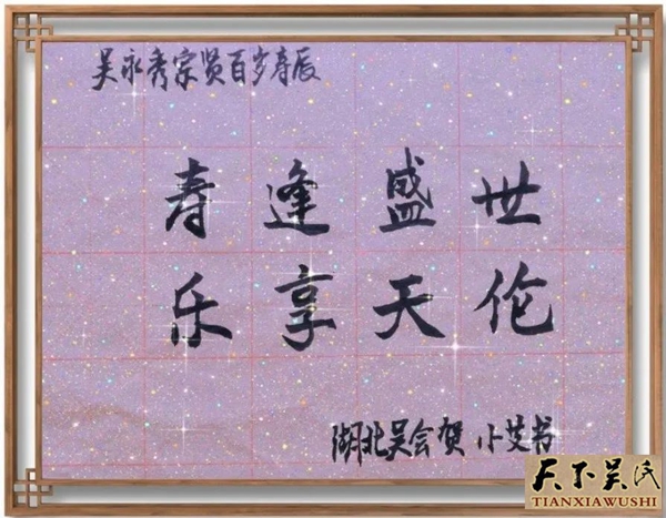 经国之衰弱,遭外敌入侵。历国之战乱,迎国之胜利。沐浴改革之春风,奏盛世之华章。今喜迎百岁之寿辰,儿孙绕膝,享六世同堂之乐,不老硕果,吴氏同庆。