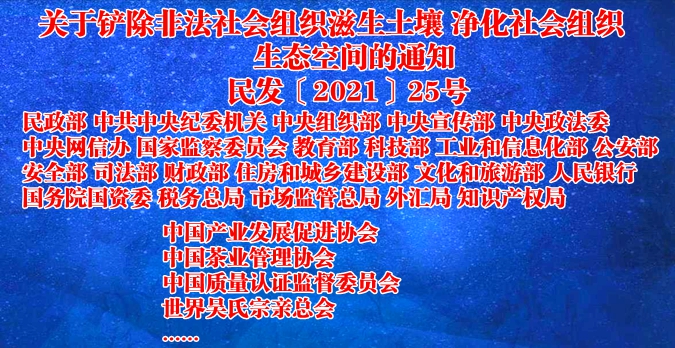 民政部 中共中央纪委机关 中央组织部 中央宣传部 中央政法委 中央网信办 国家监察委员会 教育部 科技部 工业和信息化部 公安部 安全部 司法部 财政部 住房和城乡建设部 文化和旅游部 人民银行 国务院国资委 税务总局 市场监管总局 外汇局 知识产权局《关于铲除非法社会组织滋生土壤 净化社会组织生态空间的通知》民发〔2021〕25号