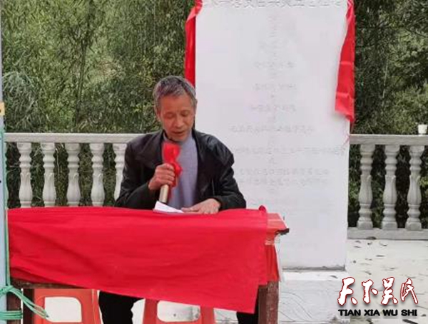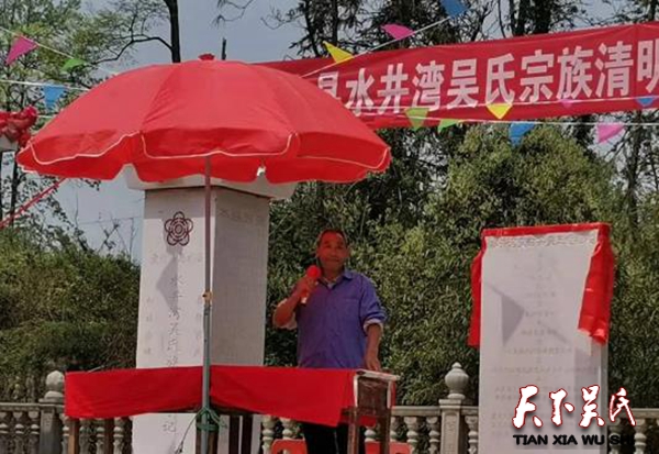 天下吴氏网讯(贵州工作站吴忠言吴忠致)2021年4月1日,春意盎然,惠风和畅,惠水县岗度镇水井湾吴氏彩旗飘扬,锣鼓喧天,热闹非凡,是惠水县吴氏宗亲为了构建和谐,牢记祖宗使命,本着“三让”美德传佳话,不忘记“至德本兼恭、诚信固家国”的家风,在此立下“宗亲族谱碑”,到会的有贵州省吴文化研究会、贵州省吴氏宗亲总会会长吴学强,省总会常务副会长、修文分会会长吴维江,省总会副会长、大方分会会长吴道友,省总会文化宣传部长吴忠致,省总会常务副会长、开阳吴氏宗亲分会执行会长吴肇俊,思南石阡吴氏族长吴有和,省总会副会长、花溪分会会长吴正祥,省总会常务副会长吴长津、惠水县老宗长吴文辉,鸭绒鸭寨吴氏宗亲代表吴大武、吴云桥,摆金吴氏代表吴天森、吴天雄、吴天智,罗甸县吴氏代表吴太鹏,岗度吴氏宗亲代表吴松美、镇远县丰岩吴氏宗亲代表吴成辅等。庆典活动由吴衡宗亲主持,贵州省吴氏宗亲总会副会长吴家栋致欢迎词,对远道而来的宗亲表示热烈欢迎,对长期关心支持吴氏文化发展的各界人士表示最诚挚的感谢!同时介绍了整个活动的策划及流程。