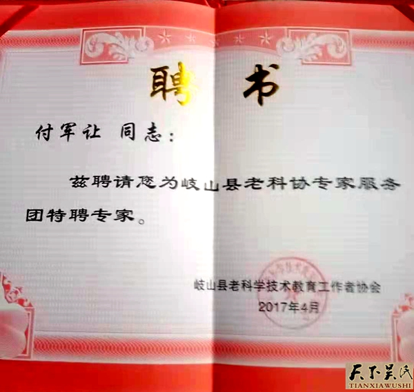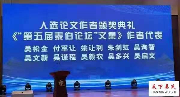 为了挖掘泰伯至德思想的根源,弘扬泰伯文化,付军让、徐丹通过在陕西省人民政府立碑保护的东坡遗址、泰伯生活过的岐山岐周王城东坡村实地调研,多学科学习,联系实际联袂撰写了巜古公亶父  英明领袖》的论文。该论文重点剖析了周太王在岐山脚下建立周原,发展壮大的历史进程及泰伯奔吴的历史原因,欢迎泰伯后裔到岐山东坡寻根问祖,祭祀泰伯。论文受到了大会组委会的高度关注,论文被收录到了全国泰伯论坛理事会、第五届全国泰伯论坛文集编辑委员会巜泰伯论坛文集》,获得了论坛优秀论文,上台领了奖。付军让先生、徐丹女士受到大会论坛的表彰奖励。无锡市人民政府原副市长吴建道亲手在台上给付军让先生颁发了荣誉证书。世界吴文化研究会会长、厦门吴文化研究会会长吴国荣博士,在这才论坛上亲笔挥毫,为付军让先生主编的《付军让周礼文化108 讲》题写了书名。