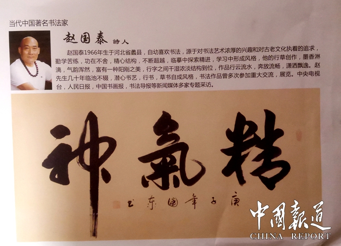 中国报道讯(吴蜀丰 报道)赵国泰,诗人,书法家,国家一级美术师,1966年生于河北省蠡县,自幼喜爱 文学,书法,源于对书法艺术浓厚的兴趣和对古老文化执着的追求,勤学苦练,功在不舍,精心结构,不断超越,临摹中探索精进,学习中形成风格,他的行草创作,墨香淋漓,气韵浑然,富有一种阳刚之美,行字之间干湿浓淡结构到位,作品行云流水,奔放流畅,潇洒飘逸。赵先生几十年临池不辍,潜心书艺,行书,草书自成风格,书法作品曾多次参加重大交流,展览。中央电视台,人民日报,中国书画报,书法导报等新闻媒体多家专题采访。现为北京金正德书画院安徽分院院长。