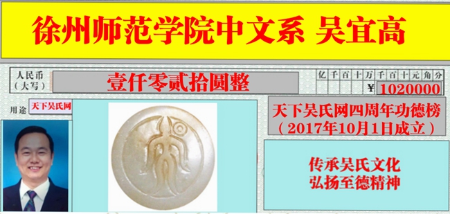近日,收到以下吴氏宗长宗贤为天下吴氏网捐款。在此深表感恩,天下吴氏网,有你更精彩!他们是吴映辉、吴燕秋、吴小容、吴靖年、吴宜高、吴维帮、吴刚虹、吴昌乐、吴风平、吴恒、吴学强、吴仁山等宗亲。