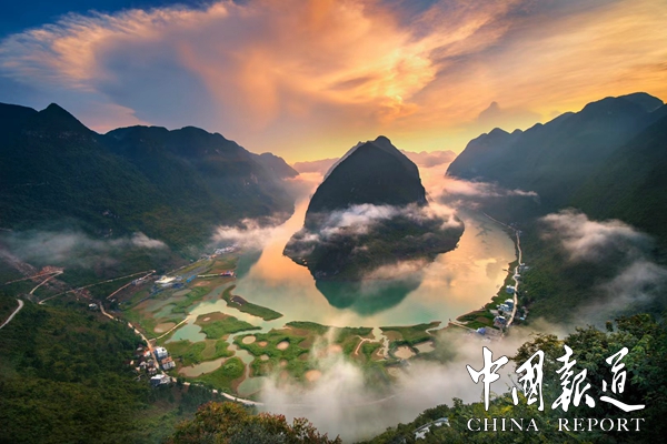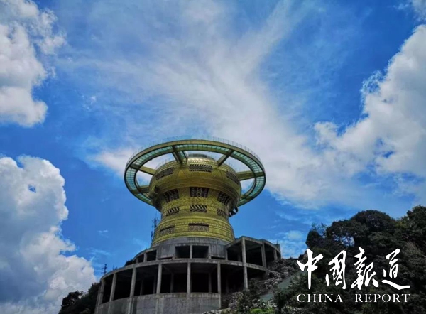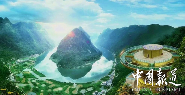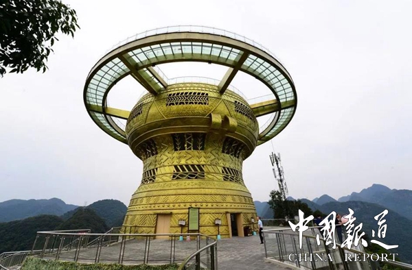 【东兰红水河第一湾铜鼓玻璃观景台】位于东兰县三石镇板文村,观景平台建设在海拔702米的一座小山峰上,观景楼铜鼓高度21.5米,铜鼓最大直径为21.5米,玻璃栈道直径为35.5米,游客可以站在700多米高的玻璃栈道上,犹如置身半空,可以一览“红水河第一湾”全景。