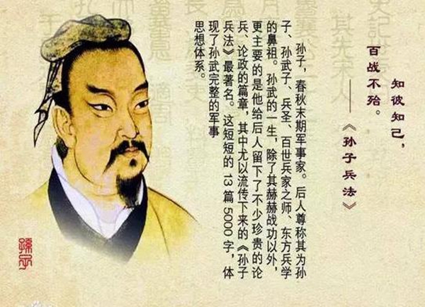 孙武(约前545年-约前470年),字长卿,春秋末期齐国乐安(今山东省北部)人。中国春秋时期著名的军事家、政治家,尊称兵圣或孙子(孙武子),又称“兵家至圣”,被誉为“百世兵家之师”、“东方兵学的鼻祖”。孙武大约活动于公元前六世纪末至前五世纪初,由于齐国不重视他而奔至吴国,经吴国重臣伍员(伍子胥)举荐,向吴王阖闾进呈所著兵法十三篇,受到吴王阖闾的重用,被封为大将军。他在柏举之战率领吴国军队大败楚国军队,占领楚国都城郢城,几近覆亡楚国。其著有巨作《孙子兵法》十三篇,为后世兵法家所推崇,被誉为“兵学圣典”,置于《武经七书》之首。他撰著的《孙子兵法》在中国乃至世界军事史、军事学术史和哲学思想史上都占有极为重要的地位,并在政治、经济、军事、文化、哲学等领域被广泛运用。被译为日文、法文、德文、英文,该书成为国际畅销书。