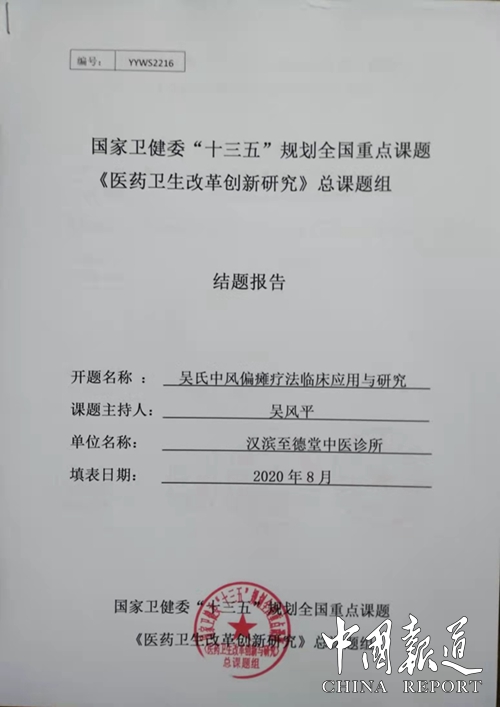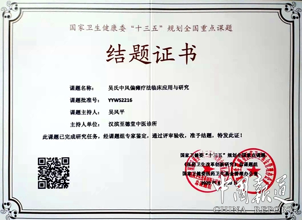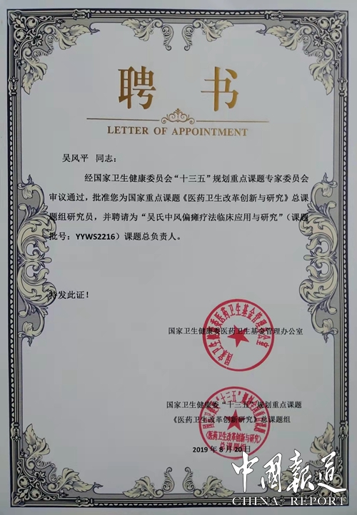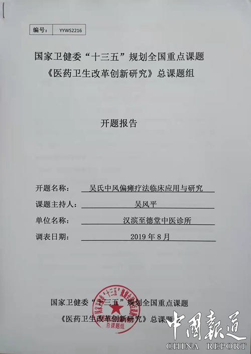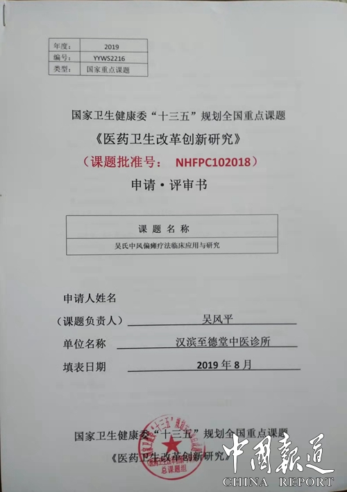 中国报道讯(吴蜀丰 报道)由陕西安康市至德堂中医诊所申报的《吴氏中风偏瘫疗法临床应用研究》课题,近日经过国家卫健委“十三五”规划重点课题《医药卫生改革创新与研究》总课题专家评审组的严格审核,被列入国家卫健委“十三五”规划重点课题“医药卫生改革创新与研究”决定立项,课题批准号:YYW52216。并且聘请至德堂中医诊所吴风平教授为“吴氏中风偏瘫疗法临床应用研究”课题负责人。据了解,该课题经过长达一年时间严格评审即2019年8月20日至2020年8月。