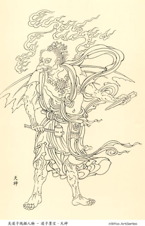 方薰:衣褶纹如吴生之兰叶纹,卫洽之颤笔纹,周昉之铁线纹,李公麟之游丝纹,各极其致。(《山静居画论》) 沈宗骞:.规矩尽而变化生,一旦机神凑会,发现于笔酣墨饱之余,非其时弗得也,过其时弗再也。一时之所会即千古之奇迹也。吴道子写地狱变相,亦因无藉发意,即借裴将军之舞剑以触其机,是殆可以神遇而不可以意求也。