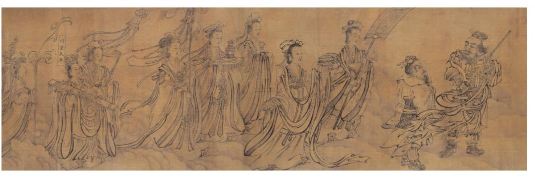 李日华:每见梁楷诸人写佛道诸像,细入毫发,而树石点缀则极洒落,若略不住思者;正以像既恭谨,不能不借此助雄逸之气耳。至吴道子以描笔画首面肘腕,而衣纹战掣奇纵,亦此意也。(《紫桃轩又缀》)