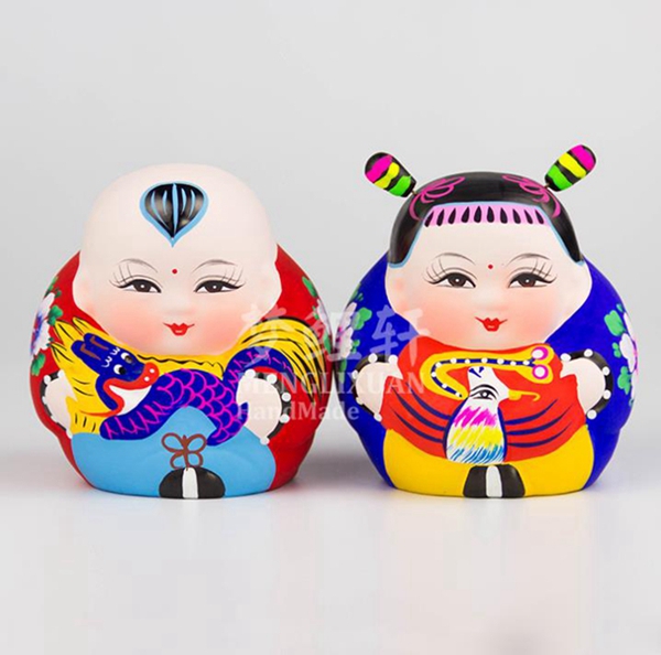 惠山泥人在制作上可分为两大类,一类是模印泥人。艺人们创作出一件样品,俗称“捏仔子”。然后制成模型,进行批量生产。模印泥人造型古朴丰满,表现手法简捷洗练。《大阿福》、《一团和气》、《三胖子》是这类作品的代表作。模印泥人数百年来始终是惠山本地的主流产品。