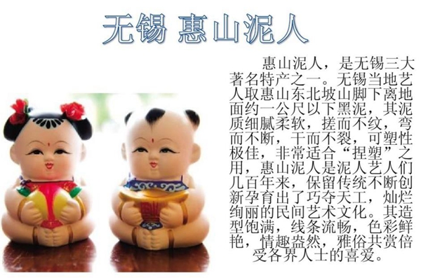 泥塑(惠山泥人),江苏省无锡市传统美术,国家级非物质文化遗产之一。惠山泥人是一种产于无锡惠北的彩色泥塑人像,它创始于明代,发达于清代,已有400多年的历史。惠山泥人分粗货与细货两类,其造型简练饱满、线条流畅明快、色彩鲜艳夺目、构思巧妙细致,作品多为儿童玩具和摆设陈品,其中的代表作品有《手捏戏文》《大阿福》等。