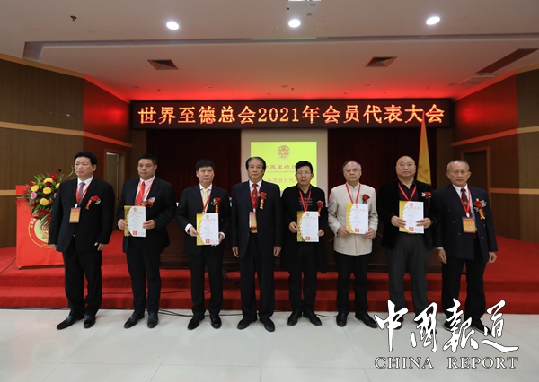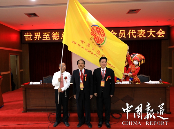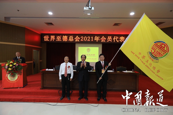 世界至德总会2022年会员代表大会将在湖北孝感举行,广西第一湾国际旅游股份公司董事长吴进枝经世界至德总会主席吴希民授权将会旗亲自交给湖北孝感吴继清。