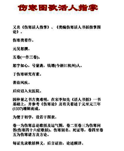 《伤寒活人指掌图》5卷。元代吴恕(蒙斋)撰于至元四年(1338年)。又名《伤寒图歌活人指掌》。明代正统初年熊宗立将本书汇入李知先《伤寒类证活人书括》,厘为10卷,后又经陈长卿重编整理为5卷。书中阐发伤寒病之辨证、治法、方药,有论、有图、有歌。卷1为运气、六经、伤寒、阴阳、热病、温病等基础理论及名词概念。卷2为伤寒问答四十六证歌。卷3为阴阳表里寒热等辨证内容。卷4至5为药评及239方注解、歌括。后附《伤寒补遗经验良方》。