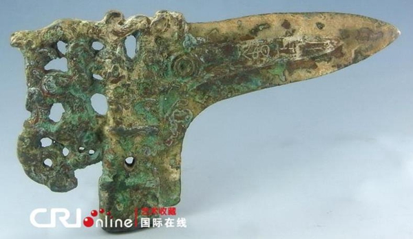 吴王寿梦戈通高6.9 cm,宽14.9 cm。戈内部呈镂空的动物造型,刻画一宽体飞龙。舌形短援,援面中间凹陷形成宽血槽,援末下垂成胡,胡后有扁圆形銎,上有一穿。援两面有8字铭文:“邗王是野 作为元用”。 “邗王”即“吴王”,是野即吴王寿梦,夫差曾祖父,开创吴国春秋霸业的先王。现藏于安阳殷畿艺术博物馆。