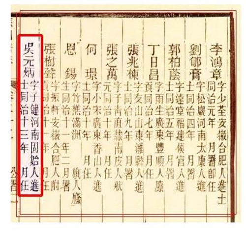 同治二年擢侍讲学士,十年出任湖南布政使,湖北巡抚。十三年调安徽,再调江苏。光绪中,先后任江苏巡抚,三署两江总督漕运总督。疏浚江苏高宝河、盐运河,勘察山东河工、海防,开挖黄河故道,兴修水利。光绪十二年卒于安徽巡抚任上。清代咸丰年间,祖籍固始的巡抚吴元炳曾以乡土特产进奉朝廷,颇受帝王后妃青睐。自此,“固始皮丝”被列为贡品。1914年被选为中国名特产品参加巴拿马万国博览会而名扬世界。