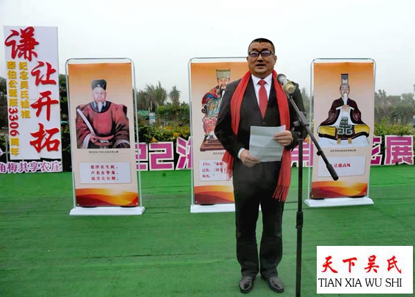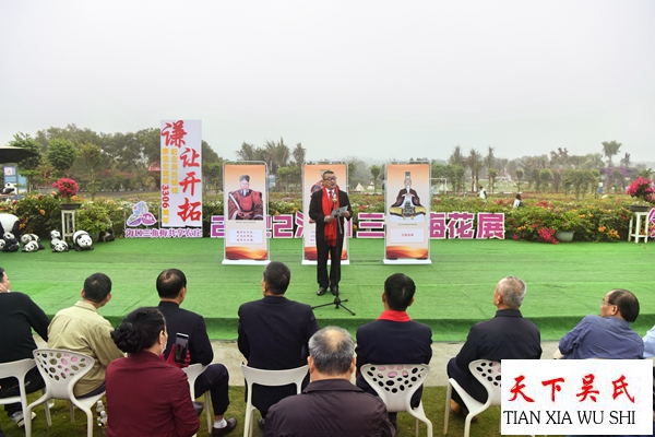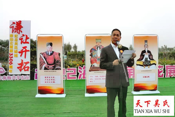 三角梅共享农庄庄主,海口市吴贤秀文化研究会会长吴林桥致欢迎词,各市县宗亲会的代表发表感言。纪念活动,特别邀请世界至德总会传统文化宣讲团团长李海波老师做了“谦让开拓永利苍生,和平发展共谋大同”的历史文化讲座。讲述了泰伯公的至德精神,弘扬至德文化的重要性。