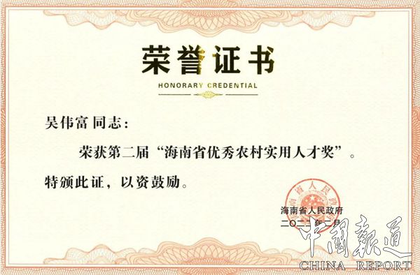 中国报道讯(吴蜀丰报道)2022年2月,海南GEF项目白沙五指山猪示范景观区的参与方吴伟富荣获“第二届海南省优秀农村实用人才奖”,该奖项是海南省农业农村厅为进一步加强农村实用人才队伍建设,充分发挥优秀农村实用人才在乡村振兴和脱贫攻坚中的示范带动作用,激励更多的农村实用人才脱颖而出、干事创业而设立的奖项。