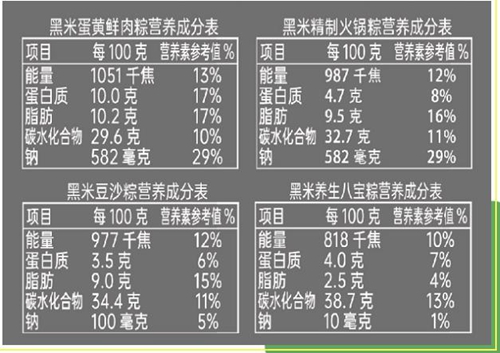 黑米养生八宝粽:100g/袋,配料:糯米、黑米、饮用水、玉米、红豆、绿豆、花生、黑米、枸杞、红枣、白砂糖。