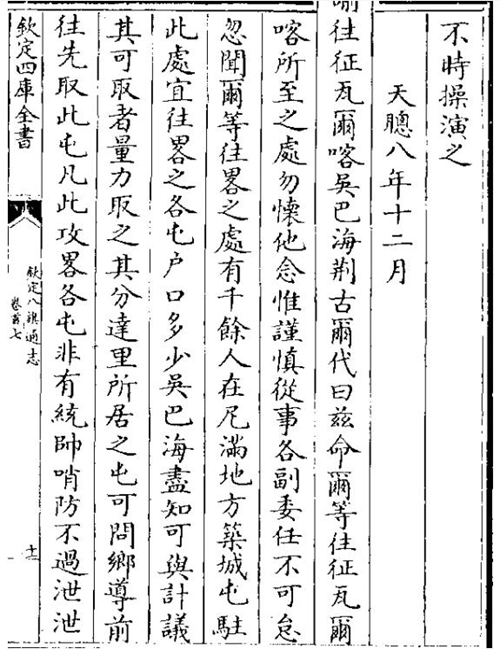 明崇祯四年(后金天聪五年,公元1631年),阿颜塔塔尔·巴海与梅勒额真蒙阿图伐瓦尔喀,略额黑库伦、额勒约索二部,收降人数千,上郊劳,赐宴,赐号“巴图鲁”。明崇祯五年(后金天聪六年,公元1632年),阿颜塔塔尔·巴海从伐察哈尔,林丹汗西遁,上命吴巴海逐逋逃,斩察哈尔兵五,获其马及牲畜。旋率师伐乌扎喇,部署所将兵四道并进,会敌方渔于握黑河,阿颜塔塔尔·巴海挥骑直前,斩三百余人,得其辎重。明崇祯六年(后金天聪七年,公元1633年),阿颜塔塔尔·巴海与牛录额真郎格如朝鲜互市,得瓦尔喀部长族属十五人以归。明崇祯七年(后金天聪八年,公元1634年),阿颜塔塔尔·巴海与吉思哈伐东海虎尔哈部。语详吉思哈传。农历12月,复与牛录额真景固尔岱将四百人伐瓦尔喀,降屯长分得里,收阿库里尼满部众千余。师还,上命大臣迎劳,以所获赉之。