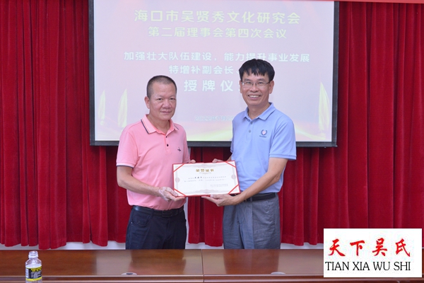会议特别表彰了在海南省级文物保护单位“吴贤秀文化公园”提升修缮改造中做出贡献的爱心宗亲,他们颁发荣誉证书以示鼓励!会议一致通过海口市吴贤秀文化研究会2021年财务报告。