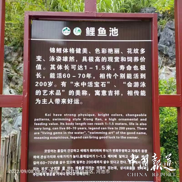 据2014年《人民日报》报道,全国有近千家锦鲤养殖场,年产值达200亿元。中国渔业协会评定的“中国锦鲤第一县”——山东高唐县,2018年锦鲤养殖面积达到8000亩,产值达2.1亿元。长乐宫景区目前是东兰县唯一的天然锦鲤养殖点。(东兰县长乐宫景区供图)