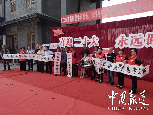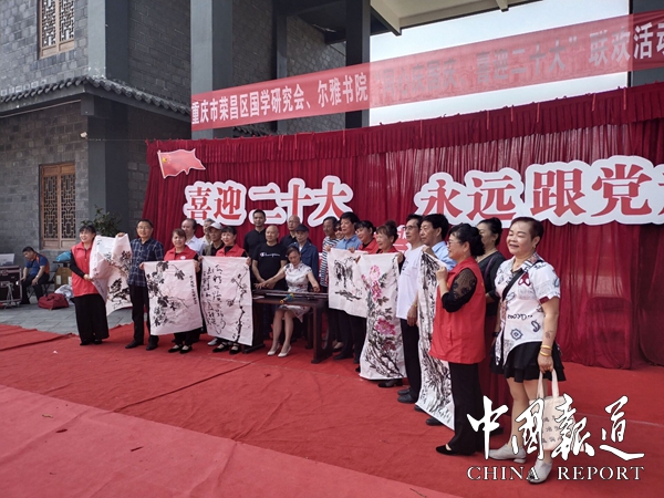 中国报道讯(吴蜀丰报道)9月30日,重庆市荣昌区国学研究会■尔雅书院在荣昌区万灵古镇万灵福邸广场开展了“同心庆国庆、喜迎二十大”联欢活动。本次活动由荣昌区文化和旅游发展委员会指导,荣昌区国学研究会主办,荣昌区国学研究会尔雅书院承办,重庆尔雅清风文化传媒有限公司,荣昌区知行社工服务中心,荣昌区学院路小学,荣昌区棠香小学,荣昌区高新区实验小学,荣昌区红苹果美德幼儿园,荣昌区苏家拳武馆,荣昌区腾达功夫搏击馆,重庆自然坊生态农业科技有限公司,重庆市荣昌区艺乡灯饰城为本次活动协办单位。