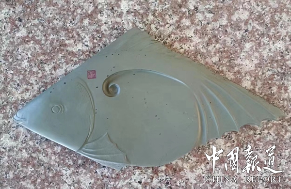 多个电话打完,那活动的前期工作大概基本布置好了,胡秋生松了一口气。他望望我,突然站起:“等一下,给你看一样东西。”他跑上楼,瞬即下来,手捧一方砚台。哇,青绿色的砚台,雕刻的是一条鱼。我用手指卡着量量,这砚台长9寸左右,宽半尺模样,半寸多厚。摸摸砚台,很是细腻温润,我心里一激灵:“这是庙前青的?”