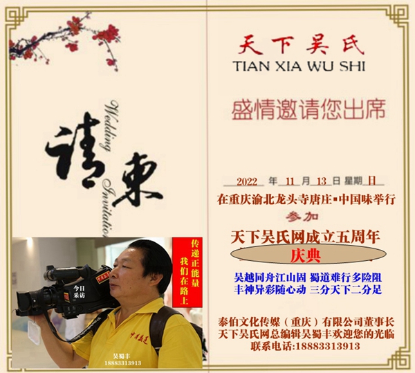 据统计已发文9142篇正能量文章。注册会员5042人,有关读者互动评论19890余条。拟定于11月13日农历十月二十(星期日)在重庆市渝北区唐庄中国味宴会厅举办天下吴氏网五周年典活动。