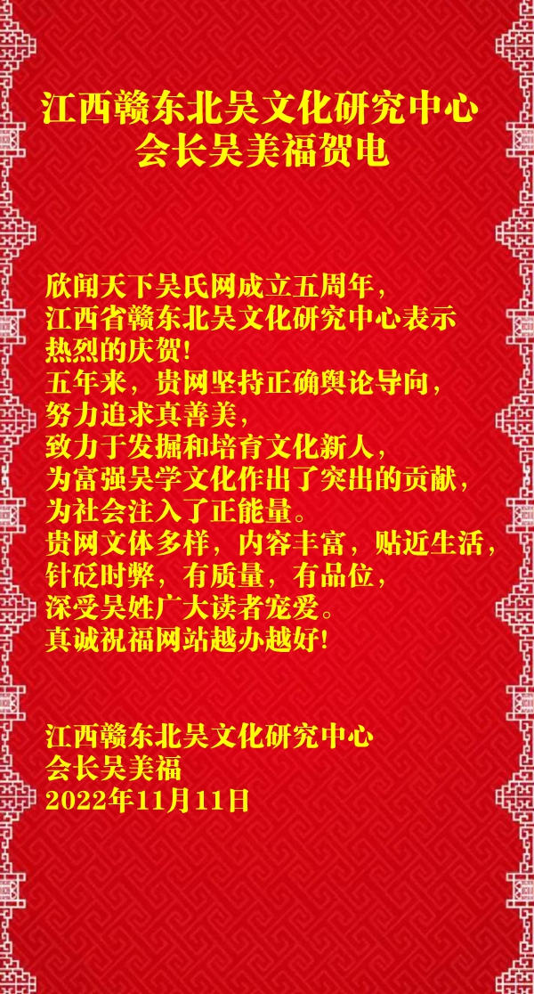 欣闻天下吴氏网贵网成立运营五周年,对此,江西省赣东北吴文化研究中心表示热烈的庆贺!