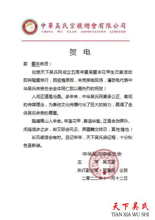 中华吴氏宗亲总会贺电