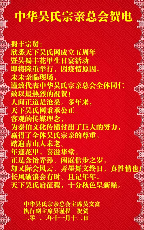 欣悉天下吴氏网成立五周年暨吴蜀丰花甲生日宴活动即将隆重举行,因疫情原因,未未亲临现场,谨致代表中华吴氏宗亲总会全体同仁致以最热烈的祝贺!人间正道是沧桑。多年来,天下吴氏网秉承公正、客观的传媒理念,为泰伯文化传播付出了巨大的努力,赢得了全体吴氏宗亲的尊重。踏遍青山人未老。年逢花甲,喜溢华堂。正是含饴弄孙、闲庭信步之岁,却又际会风云、弄墨舞文终日,真性情也!长风破浪会有时。且记年年,天下吴氏启征程,十分秋色呈新绿。