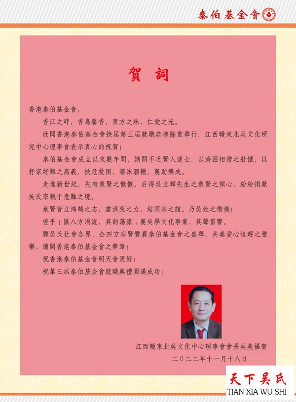 江西赣东北吴文化研究中心会长吴美福致香港泰伯基金会贺电