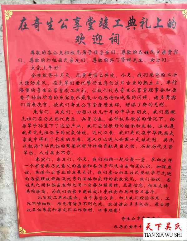 各公支代表、外祖巫氏亲友代表、各姓氏乡邻代表厚礼相送,共同庆祝奇生公享堂吿竣。奇生公后裔在各行各业努力拼搏,人才辈出。个个都在为国家的发展,吴氏宗族的兴旺发达奉献自己的力量。展现了中华民族大团结精神,充分彰显了“吴氏一家亲”的精神。