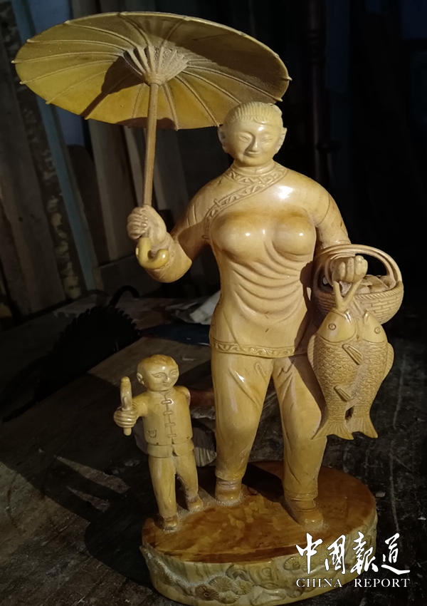 一幅活生生的木雕画引人注目,一位少妇右手举着遮阳伞,左手腕提着的小竹篮,里面装水果,同时腕挂两条鲤鱼,站在右边的一位男童身着唐装,深刻地彰显出一幅美好生活的画面。