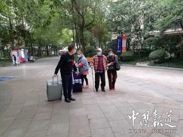 下午6点,我们进入恒大名都小区,刚走了几步,一个姓赵的女士便主动前来帮我们拉行李,看来她是本小区没有一分钱报酬的志愿者。紧接着又来了一位中年男士,一只手拖一个拉杆箱,一直把我们护送到家门口,我用手机拍摄下这动人的一幕。