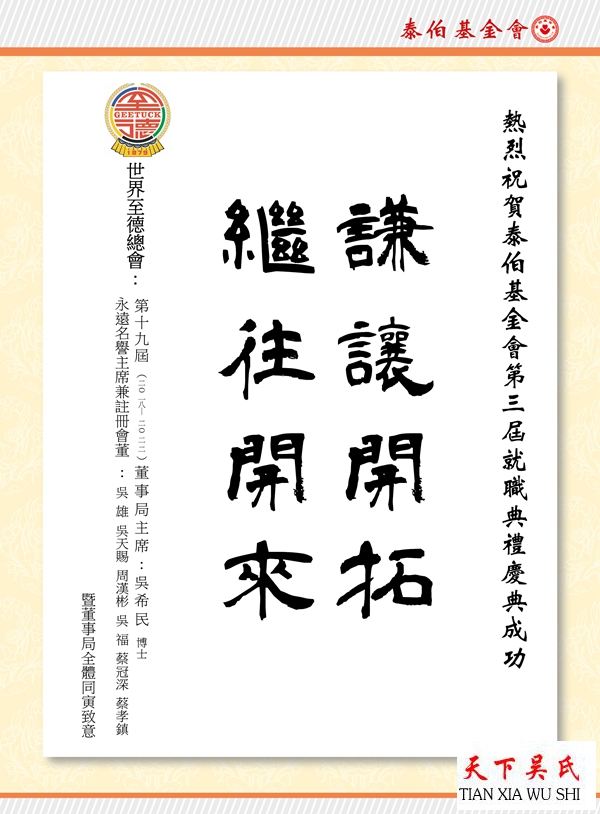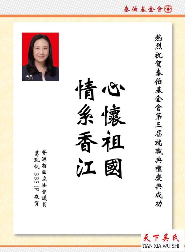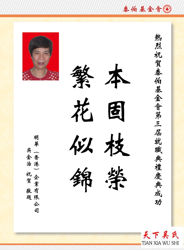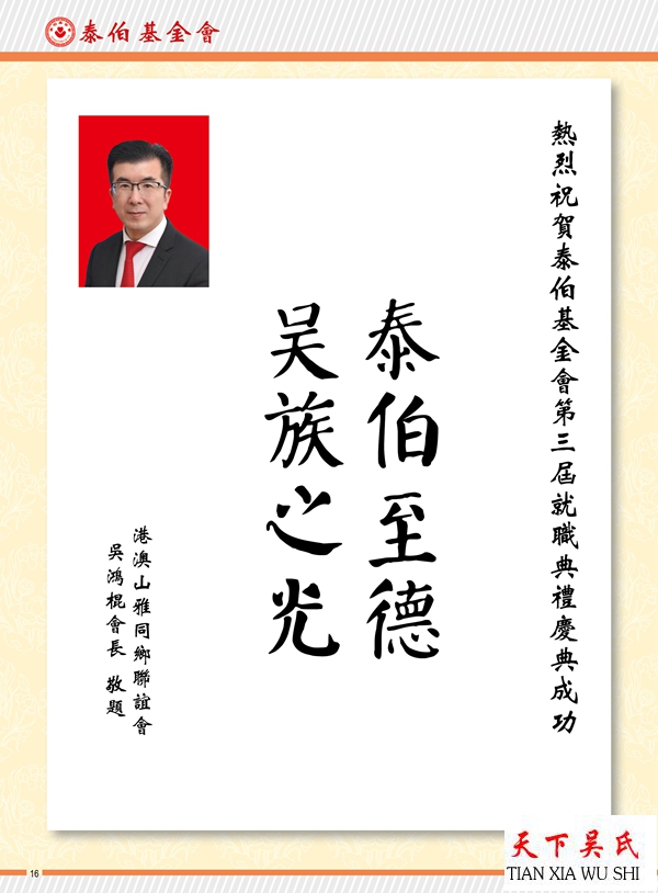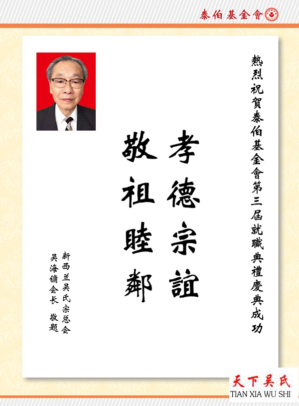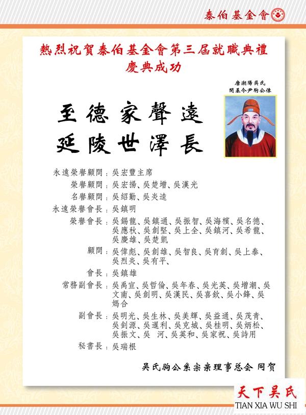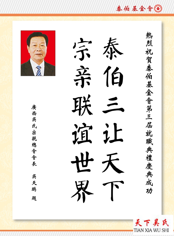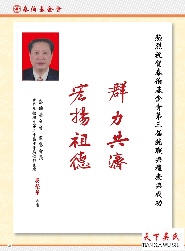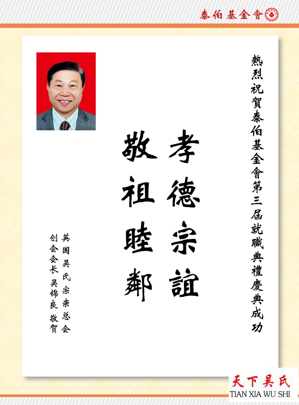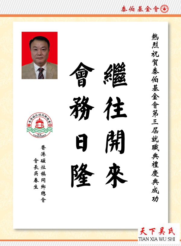 天下吴氏网讯(驻香港工作站吴昌禄报道)12月16日,泰伯基金会将举行第三届就职典礼活动,目前已收到来中国大陆及海外吴氏宗亲及社会各人士,社团组织30多份贺电(排名不分先后)。