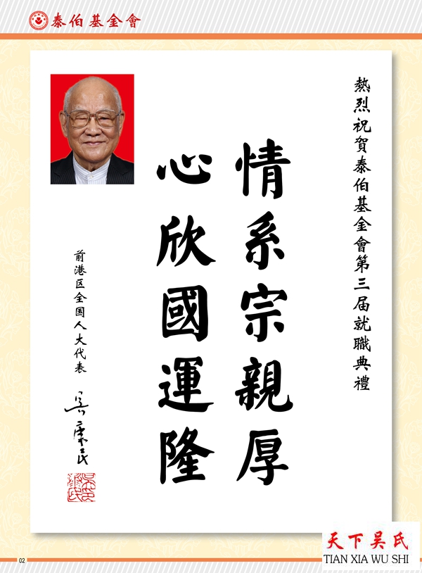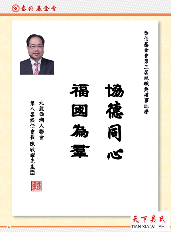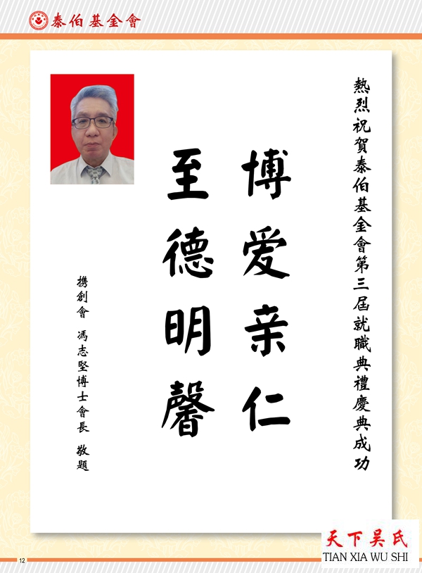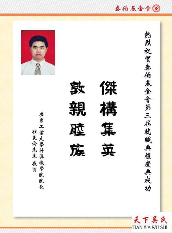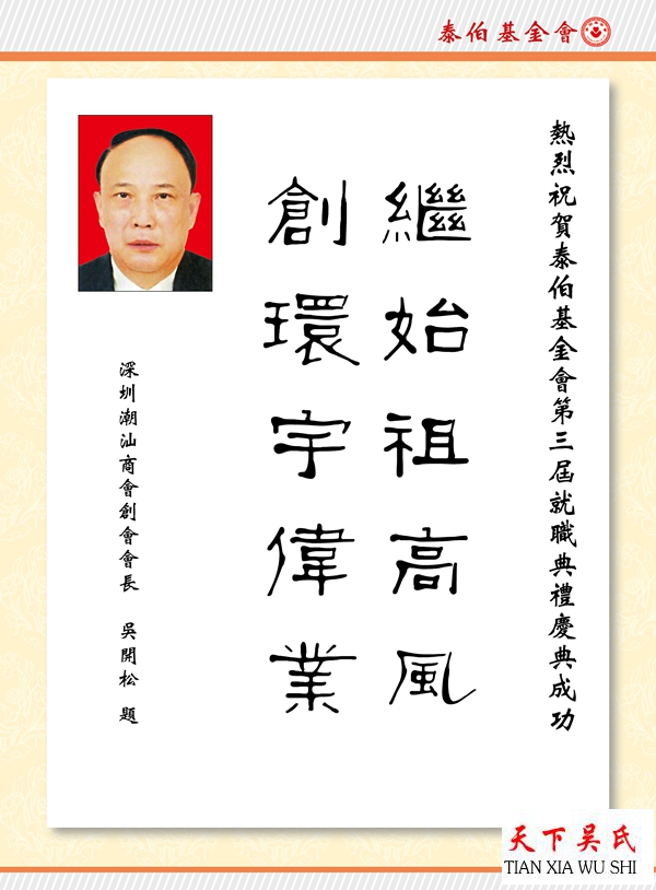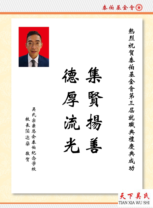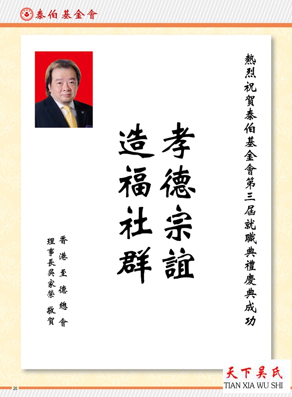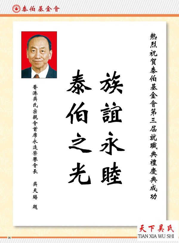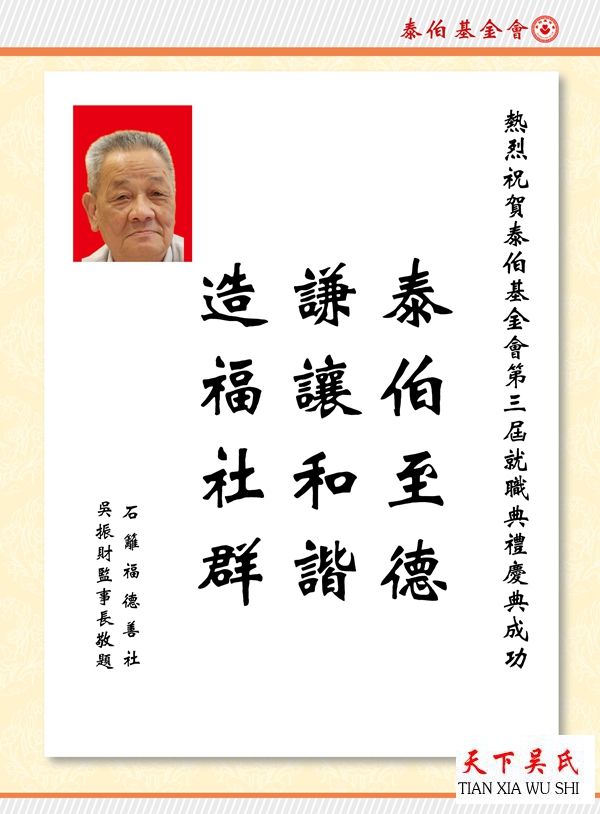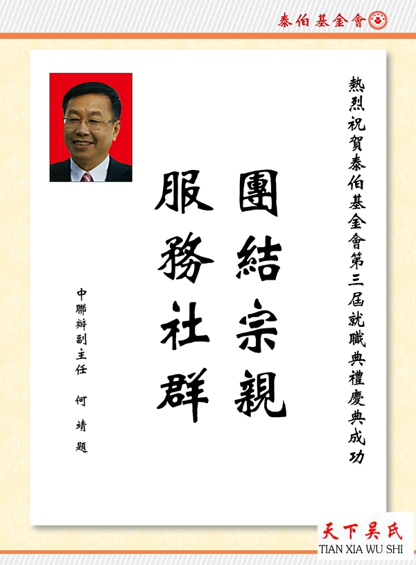 天下吴氏网讯(驻香港工作站吴昌禄报道)12月16日,泰伯基金会将举行第三届就职典礼活动,目前已收到来中国大陆及海外吴氏宗亲及社会各人士,社团组织30多份贺电(排名不分先后)。