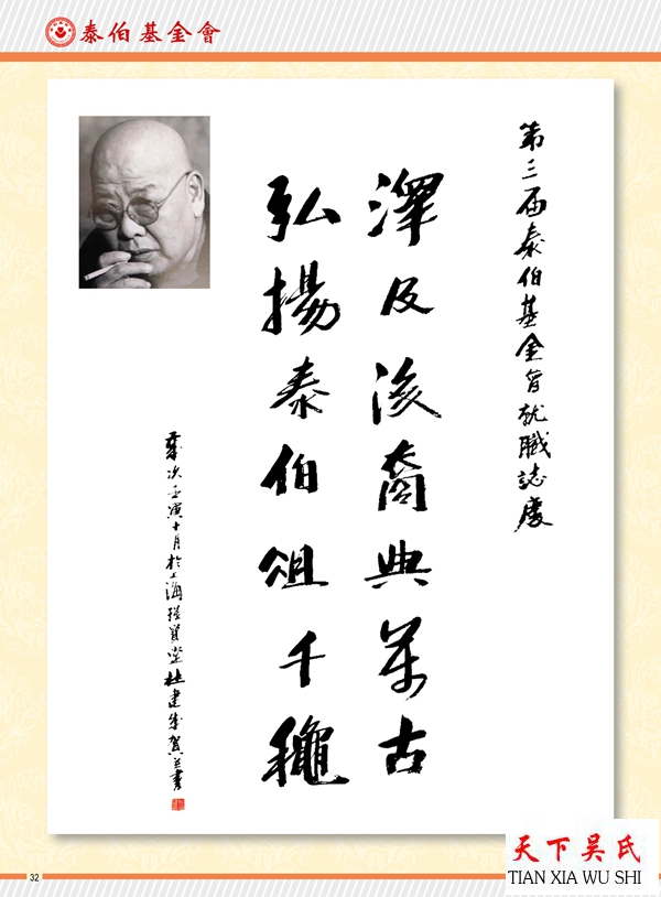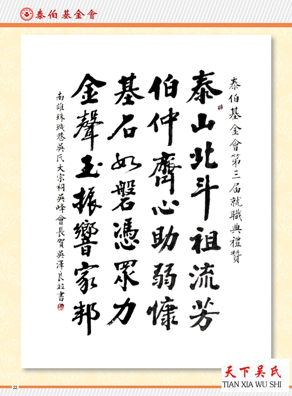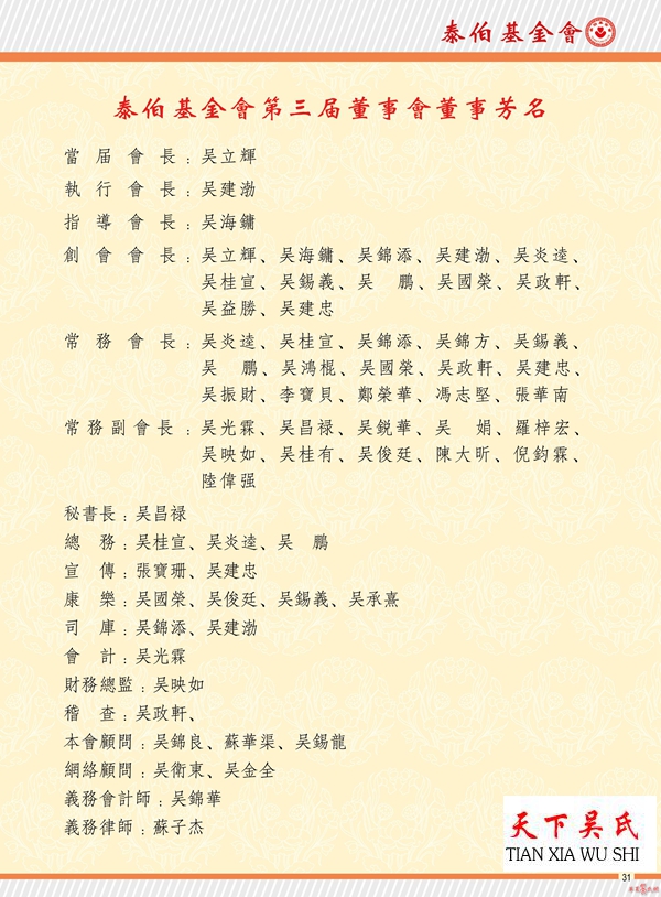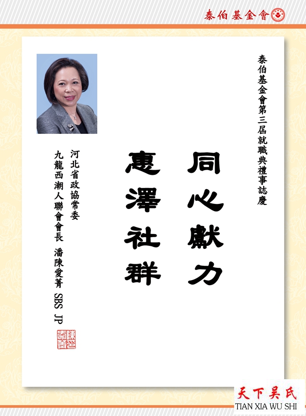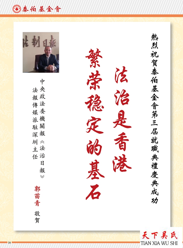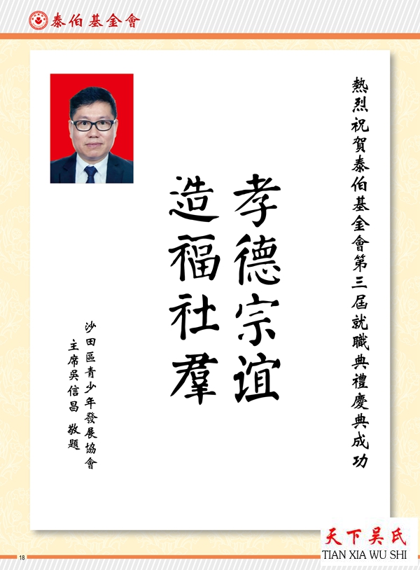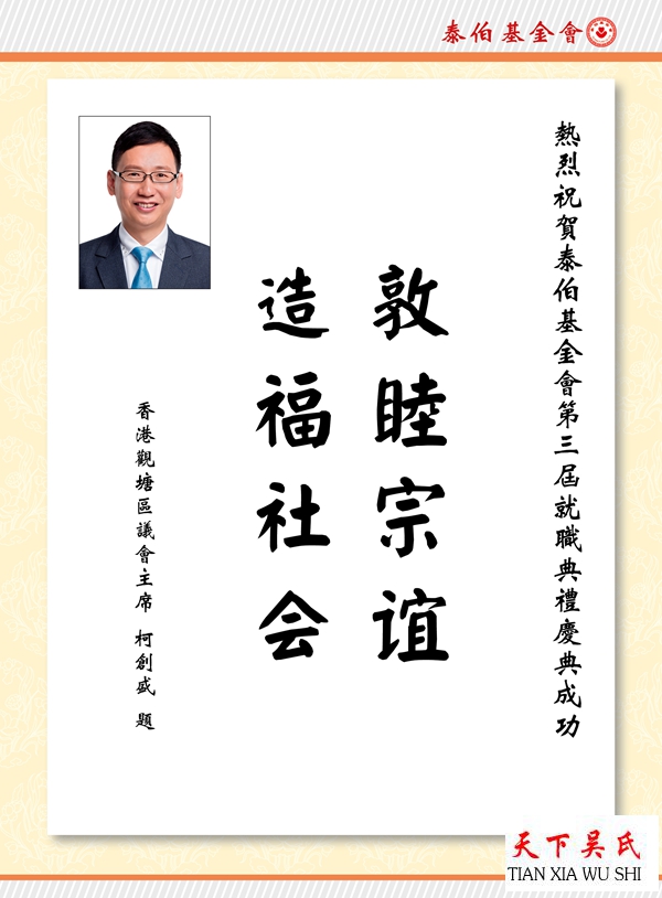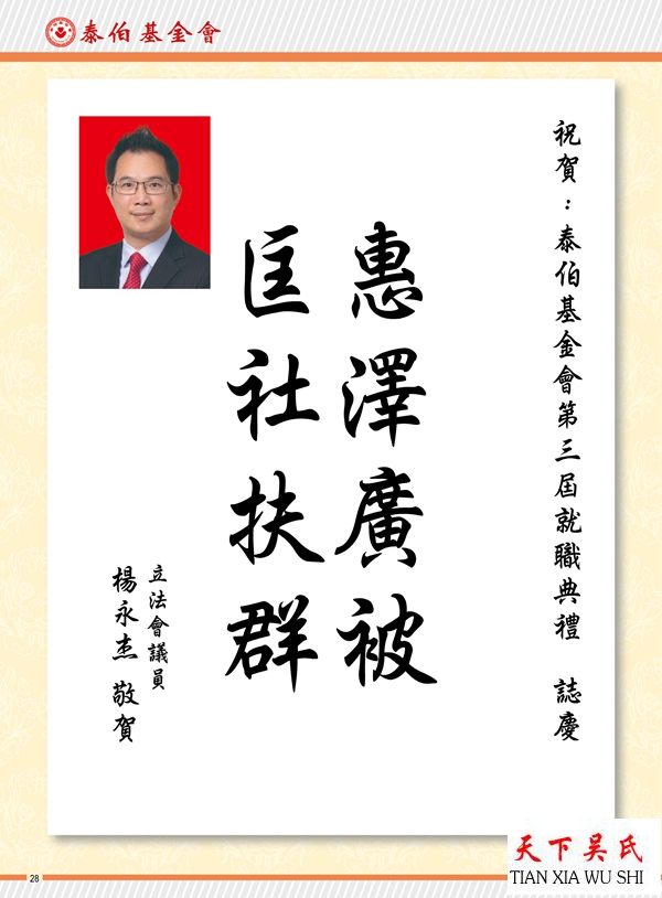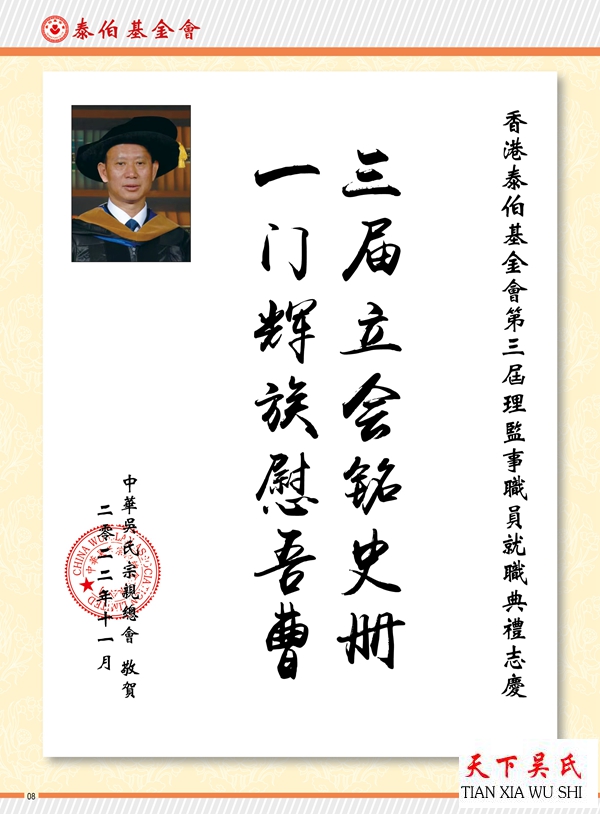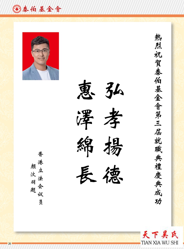 天下吴氏网讯(驻香港工作站吴昌禄报道)12月16日,泰伯基金会将举行第三届就职典礼活动,目前已收到来中国大陆及海外吴氏宗亲及社会各人士,社团组织30多份贺电(排名不分先后)。