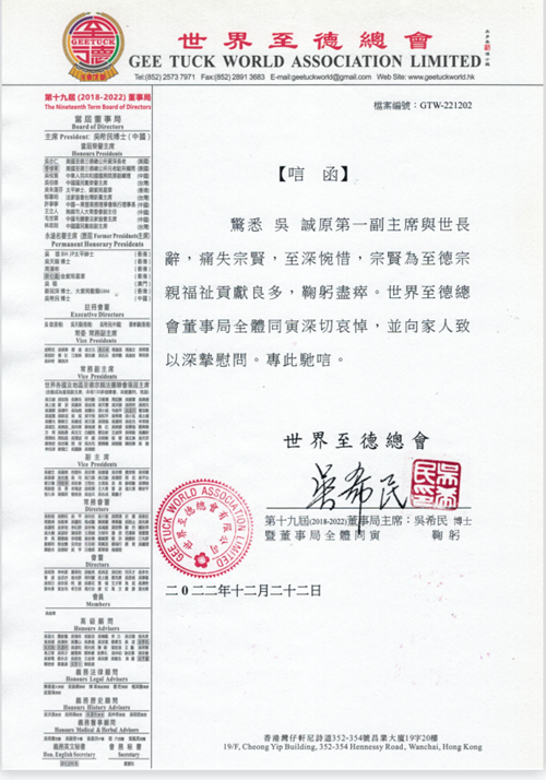 世界至德总会唁函