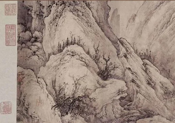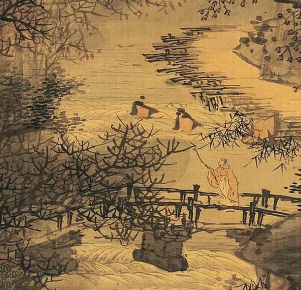 吴宏 小山远歌图【名称】清 吴宏 小山远歌图【年代】清代【简介】长卷,纸本,纵30.8厘米,横137.1厘米。上海博物馆藏。此图绘参天老树,枝槎纵横老健,溪水沿山蜿蜒潺流,树丛茅屋书斋深藏;平坦处,一老者抱琴席地而坐,面山临水高童子身后侍立。笔情墨韵与诗情画意尽在其中。