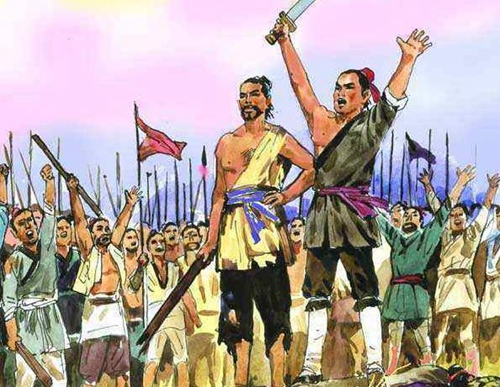 陈胜铿锵有力的一番话,说出了大伙的心声,戎卒们对秦王朝的满腔怨恨和愤怒如同冲溃了堤坝的洪水奔泻而出,齐声高呼:“我们愿听从您的号令!” 于是大伙在陈胜、吴广带领下,袒露右臂作为标志,筑坛盟誓,按事先谋划,诈以公子扶苏、楚将项燕之名,宣布起义。 陈胜自立为将军,以吴广为都尉,一举攻下大泽乡,迅速攻下蕲县县城。 中国历史上第一次大规模的农民起义战争爆发了。