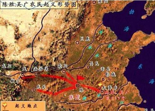 旗开得胜 大泽乡起义后不到一个月,起义军已经拥有战车六、七百辆,骑兵1000多人,步兵几万人。在控制了安徽、河南交界的大片地区后,起义军即决定进攻战略要地陈县。陈曾是战国后期楚国的都城。秦灭六国后,又把陈县定为郡治,足见其地位之重要,如能拿下陈县,对秦无疑是个重大打击。于是,陈胜率领起义军直逼陈城。陈地郡守和县令闻风丧胆,早逃之夭夭,只留下郡丞(郡守副职)龟缩城内,负隅顽抗。已是惊弓之鸟的守城秦军在起义军的强大攻势下很快土崩瓦解。起义军杀了郡丞,开进陈县县城。 起义军进城几天之后,号令召三老(秦时掌管教化的乡官)、地方上的豪杰都来商议大事。三老豪杰都说:“将军(指陈胜)身披坚执锐,伐无道,诛暴秦,复立楚国之社稷,功宜为王。”陈胜于是自立为王,国号“张楚”。 张楚有张大楚国的意思。这是因为这一地区正是当年楚国的旧境。百姓怨秦的暴政,自然怀念楚的过去。陈胜、吴广就是借被胡亥害死的扶苏以及受到楚人尊敬的楚将项燕的名义号召起义的。因此建立的政权也以“张楚”为口号。陈胜任命吴广为假王,率军西击荥阳,命武臣、张耳、陈馀北攻赵地,邓宗南征九江,周市夺取魏地。