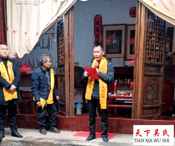 吴庸公二房的吴经刚在发言中说,今天,我们吴氏家族在咱们祠堂隆重祭奠我们的祖先,追忆先人的丰功伟绩,联谊吴氏家族的亲情友情,共谋吴氏家族的发展大业,我感到无比的自豪和荣幸。