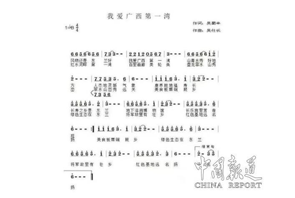 据天下吴氏网总编《我爱广西第一湾》歌词作者、资深媒体人、作家、中国报道《魅力城乡》主编吴蜀丰介绍,《我爱广西第一湾》不仅是广西第一湾国际旅游股份有限公司对外形象展示的企业之歌,主要是宣传展示人文丰富、物产丰厚的东兰旅游业。