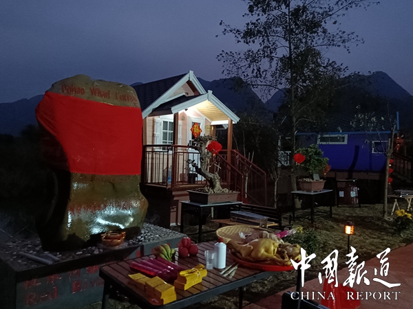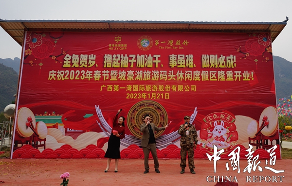 中国报道讯(通讯员  岑福山 覃 源)2023年大年三十日上午,广西第一湾国际旅游股份有限公司东兰县红水河坡豪旅游码头景区,彩旗飘扬,歌声嘹亮,人头攒动,因疫情原因沉寂了三年的坡豪旅游码头名胜风景区沸腾了,人们奔走相告,第一湾公司木屋别墅酒店竣工对外开放庆典活动在这里隆重举行,即日起接受全年预定。