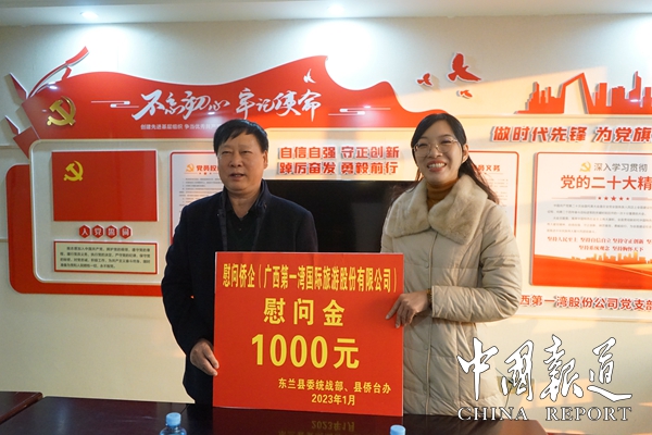 中国报道讯(通讯员 岑福山 覃 源 麦国新)1月31日,中共东兰县委常委、统战部长韦彩秀、副部长吴雪梅走访慰问民营企业广西第一湾国际旅游股份有限公司,与公司班子成员座谈交流,给公司带来了慰问金、东兰君兰花、饮料等慰问品,送来了新春的问候和祝福。