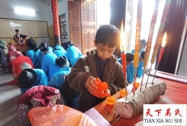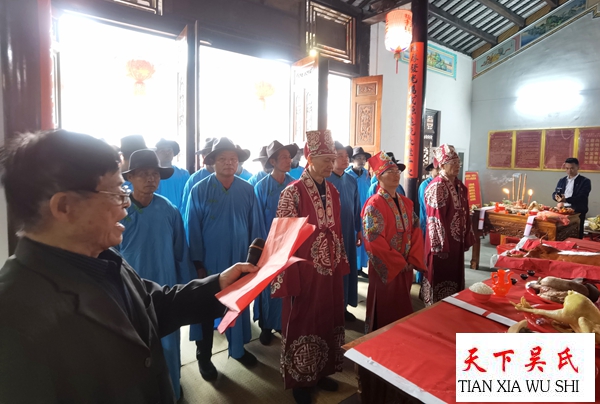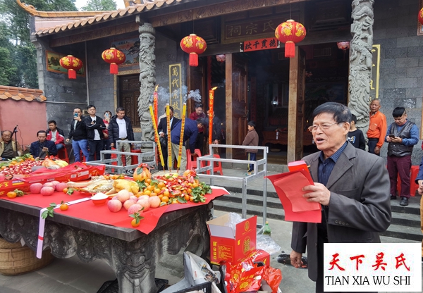 当天下午1点吴氏祠堂灯火辉煌,香炷的柱台燃烧着祥和的晶莹烟云,祖先神牌前中间、两侧,整整齐齐地排放着各支丁的供奉祭品。祠堂里尽显对祖先敬仰恩德氛围。祠堂前,八音乐队吹打起悦耳动听的民乐,在鞭炮声声中共鸣。主祭师带有蕴意的口语颂读叩拜祝文,主祭,陪祭行礼仪,场面庄严肃穆。随着向祖先行礼献猪、献鸡、献鱼、献水果、献酒等祭拜活动在炮竹声声中结束。