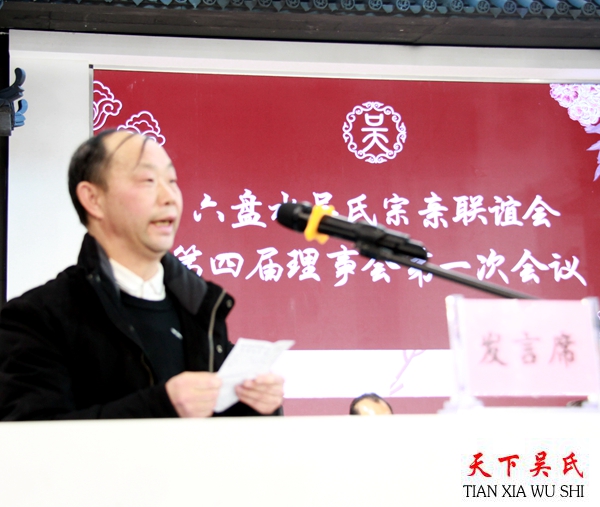 天下吴氏网讯(吴蜀丰贵州六盘水工作站吴学刚吴恒报道)新春新气象,至德谱新篇。2月25日,六盘水吴氏宗亲联谊会第四届理事会在六盘水市好百年宴会艺术中心锦竹轩厅如期举行。联谊会副会长吴道贤作第三届理事会工作报告,副会长吴远华就第三届理事会财务收支情况作报告。会议经推选产生第四届理事会会长和副会长,推选吴进为会长,吴远华、吴学贤、吴维平、吴道贤、何天才、吴频、吴智高、吴道光、吴恒为副会长,吴频兼任秘书长。选举产生的160名联谊会理事。会议由副会长兼秘书长吴频主持。