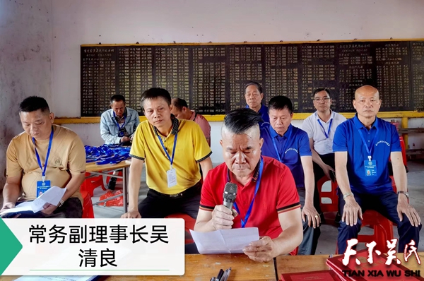 会议由吴崇胜主持。在奏唱国歌后,吴清良宣布2月9日第一次理事会议提名的理事候选人名单。按会议议程,通过举手表决一致通过,选举产生了第二届理事会、监事会。吴天庆当选理事长,吴崇胜当选监事长,吴清良当选常务副理事长,吴育辉、吴钟天当选副理事长,聘任吴昊为秘书长,顾问及70名宗亲为理事。