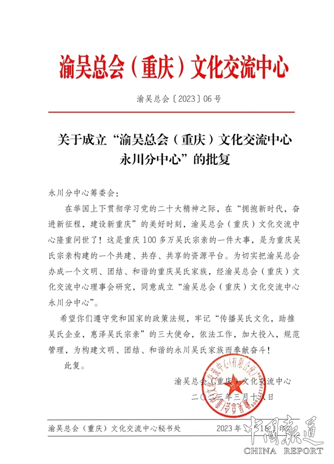 事实告诉人们,任何事物的成长,都是一个不断完善的过程。渝吴总会也是这样在不断地走向完善,以致更好地担负起推动全重庆吴氏家族事业蓬勃发展的重大使命。(传承吴氏文化,助推吴氏企业,惠泽吴氏宗亲)这三大使命就是渝吴总会的办会目标。我们深切而诚挚地期待:渝吴总会(重庆)文化交流中心永川分中心成立大会必将——又是一年芳草绿,依然十里杏花红!再为渝吴总会递交一份满意的答卷,创就渝吴总会优秀区县分中心的壮丽篇章。
