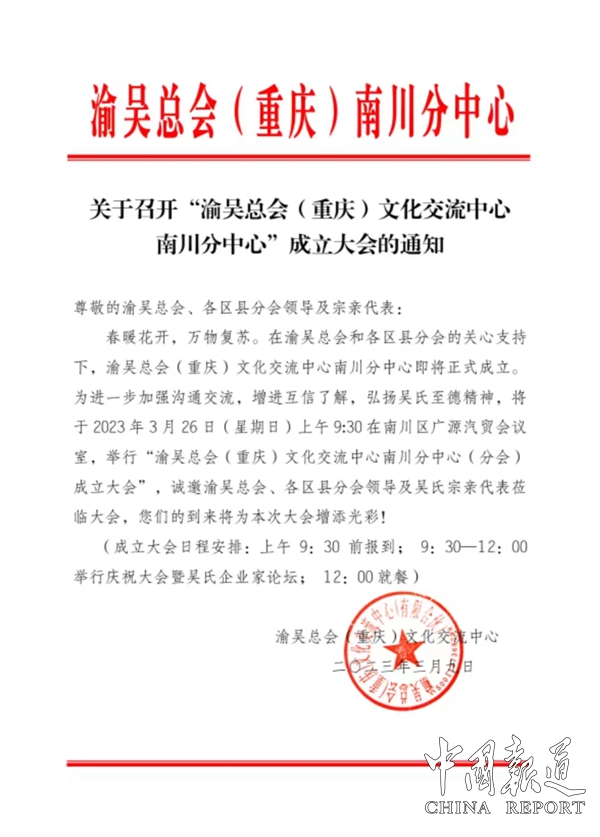 中国报道讯(吴蜀丰报道)3月26日,渝吴总会(重庆)文化交流中心南川分中心正式挂牌成立,来自渝吴总会大足区、铜梁区、南岸区、巴南区、南川区、渝北区及丰都县等地的分中心负责人参加本次活动。